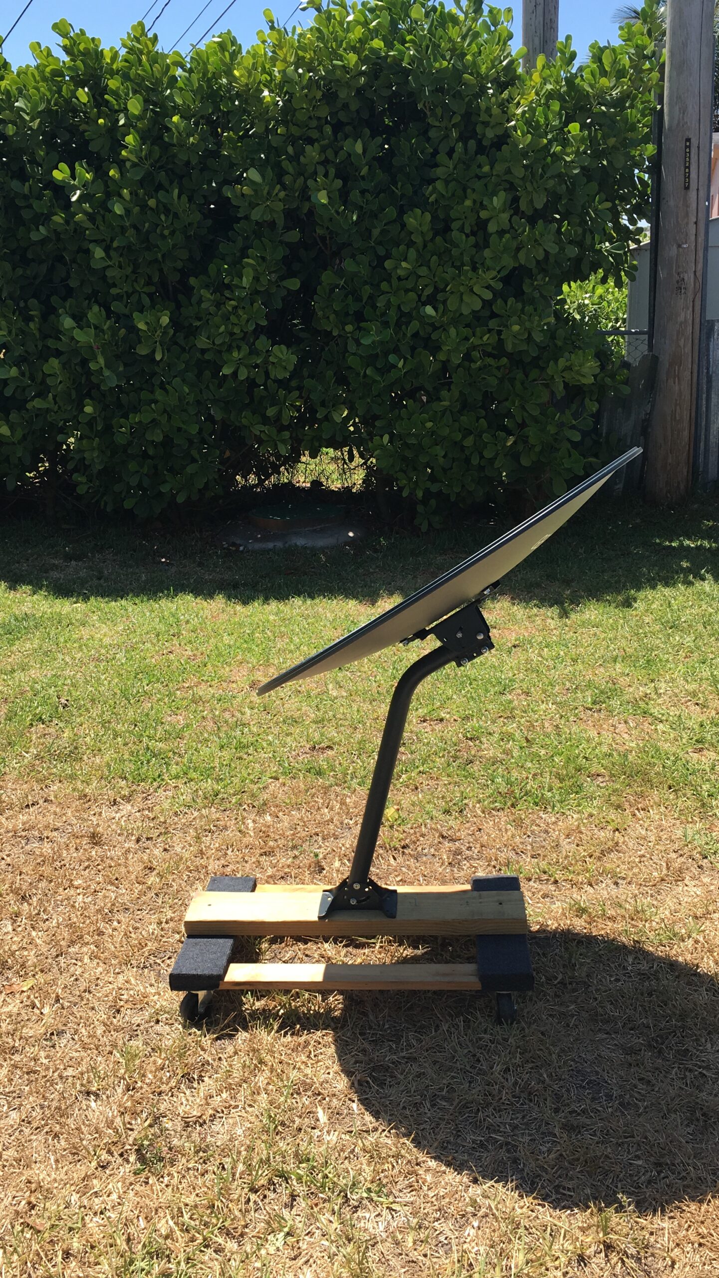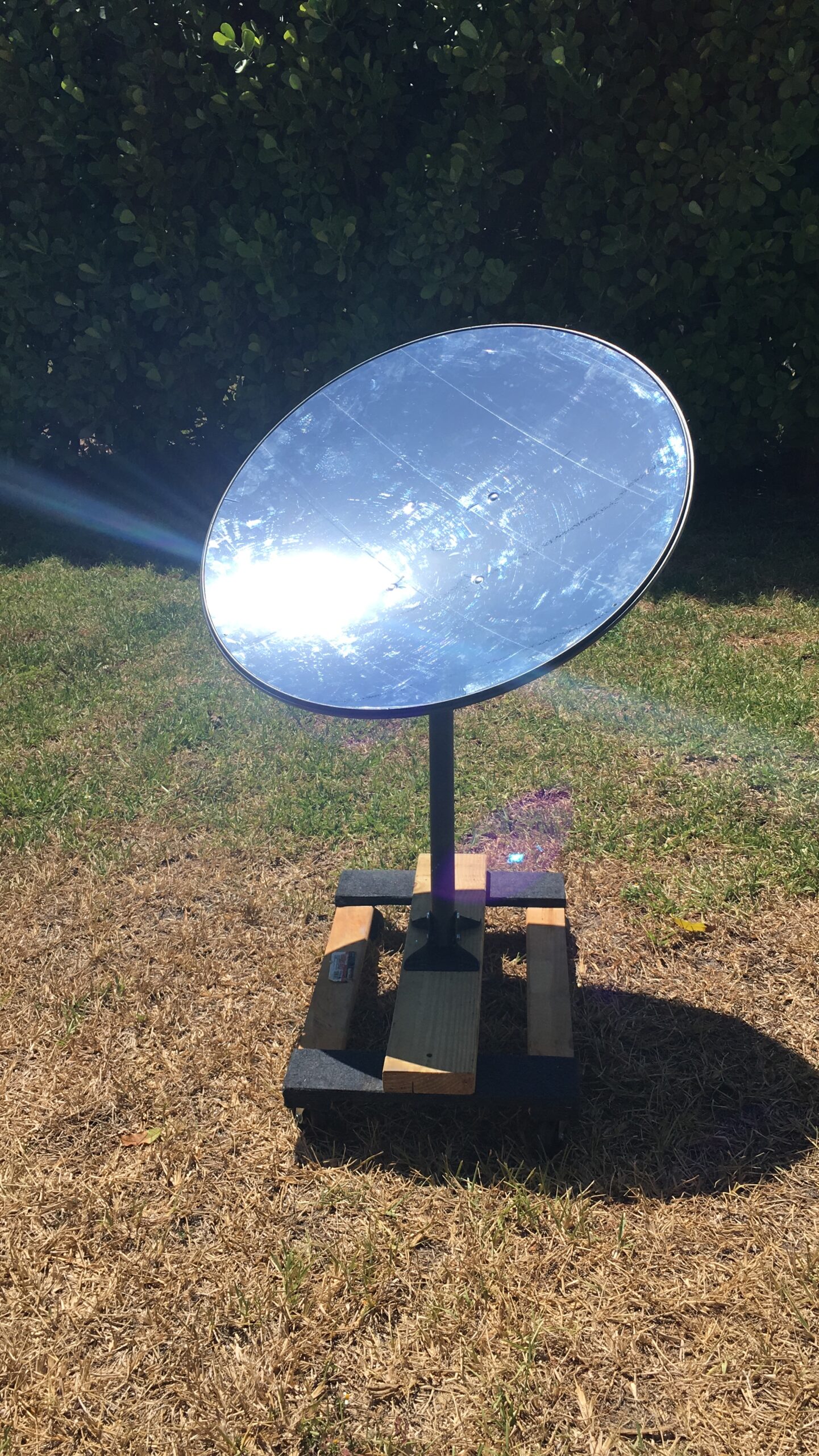 First of all we need the sun. Check the weather, hopefully there’s no clouds. Then take the parabolic cooker outside and point the satellite south. Use the 2 by 4 inch plank to find the focal point which is about 25 inches from the vertex of the parabola (between the center of the satellite and the sun). Once the focal point has been found, the wood will instantly burn from a concentrated beam of heat reflecting from the sun at an exponential rate. That beam must then be pointed at the pan, pot, coffee distiller or anything you’d like to heat. Grab microphone stand with grill attached and just adjust height to match the focal point. Next, place 2 by 4 inch wood plank over the grill to make sure it catches fire. If so, you have completed the alignment process hence are now ready to cook. Keep in mind, the same way the sun is always burning, it is also constantly moving so readjust of focal point (towards the sun) will be needed though the cooking process.